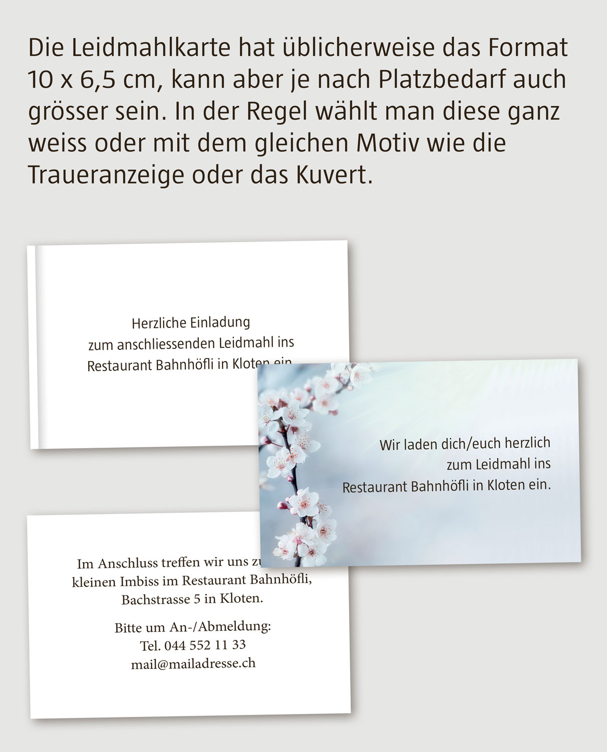 Eine Abdankung oder Beerdigung ist ein trauriger Anlass. Oftmals wird bei einem anschliessenden Apéro, kleinen Imbiss oder Essen (Leidmahl) nochmals Rückblick auf die verstorbene Person gehalten. Dabei gedenkt man auch der fröhlichen Momente und teilt Erinnerungen. Um einen ausgewählten Personenkreis über ein anschliessendes Leidmahl zu informieren, legt man der Trauerkarte eine Mitteilungskarte bei. Diese hat in der Regel die Grösse einer Kreditkarte. Wenn das Restaurant bereits bekannt ist, führt man dieses auf. Wenn dieses noch nicht bekannt ist, kann der Pfarrer erwähnen, in welchem Restaurant sich die eingeladenen Trauergäste treffen. Sind alle dazu eingeladen, kann man dies auch direkt auf der Traueranzeige erwähnen.